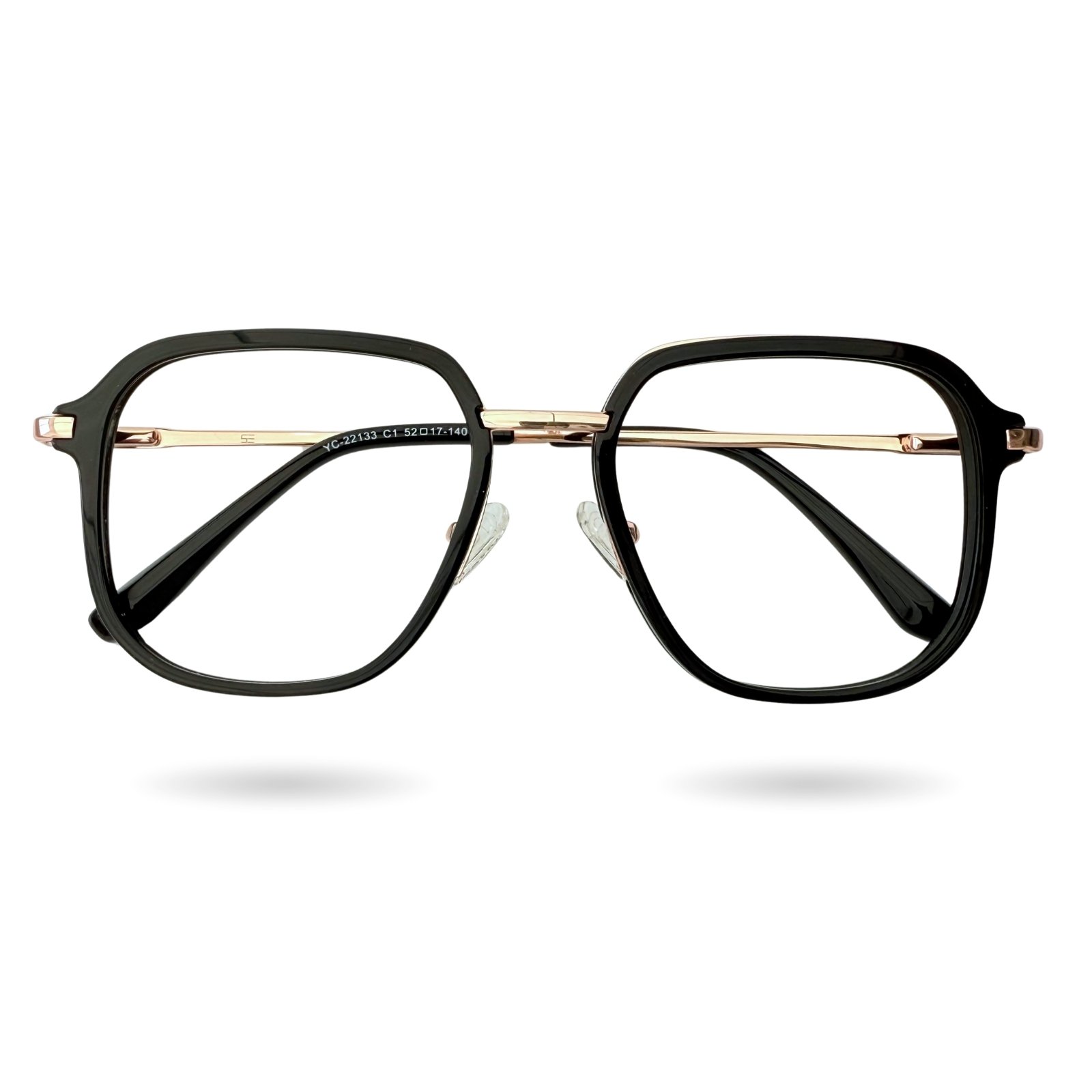 Diseño geométrico en metal negro con acentos dorados en el puente y los aros, que aporta una estética sofisticada y moderna. Su silueta combina formas cuadradas y redondeadas, creando un equilibrio visual atractivo. Las varillas negras y pads nasales ajustables garantizan comodidad y estilo. Este modelo es ideal para quienes buscan un look profesional con un toque de lujo discreto. Perfecto para lentes graduados.
