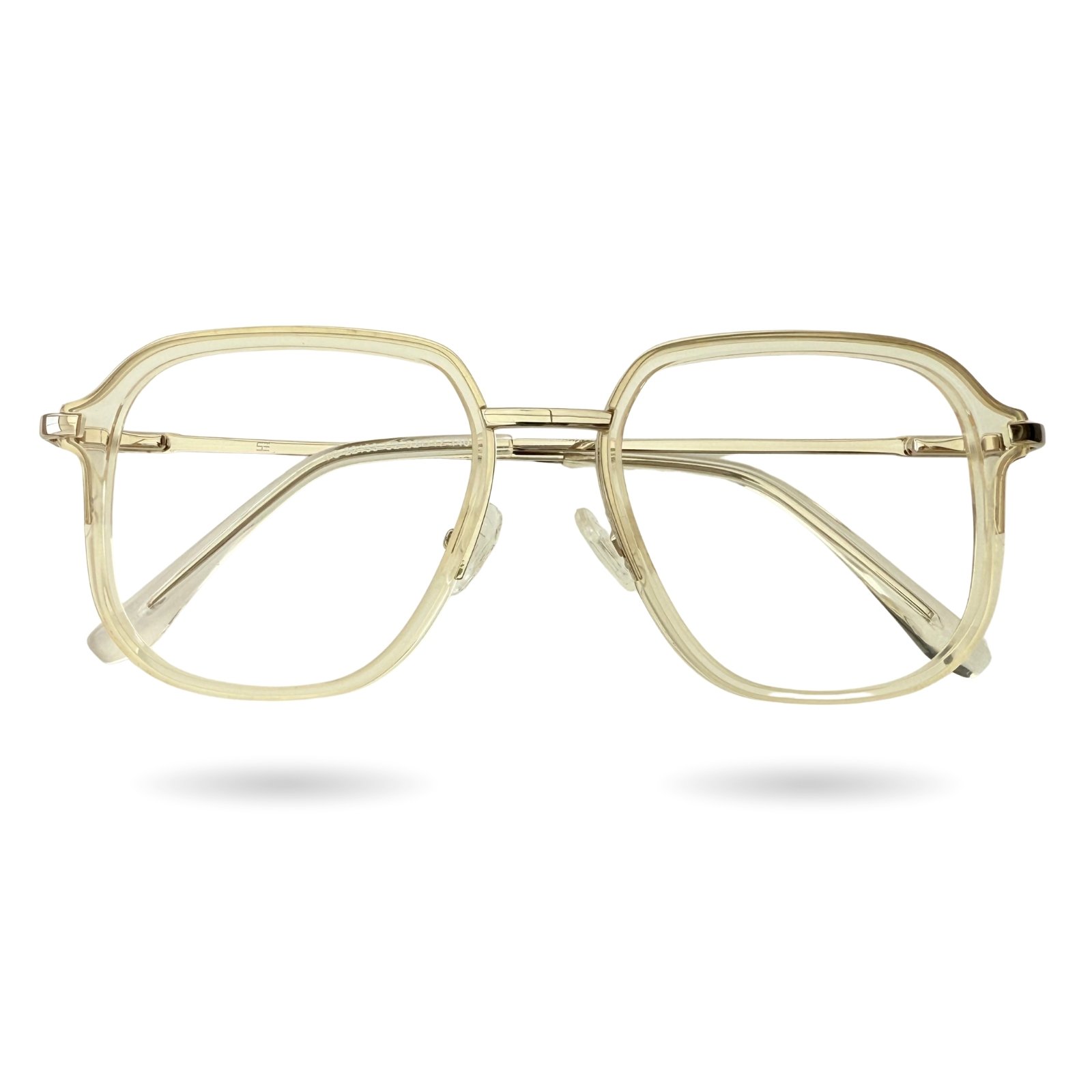 Detalles: Puente dorado, aros dorados parciales y diseño estilizado.